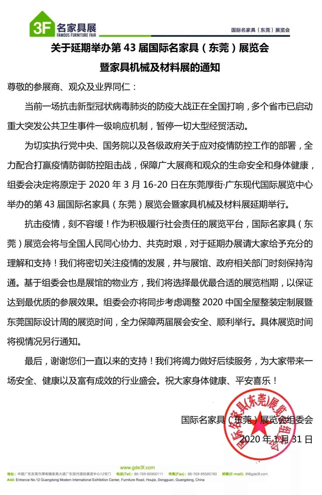 重要通告 | 第43屆國(guó)際名家具(東莞)展覽會(huì)暨家具機(jī)械及材料展將延期舉行